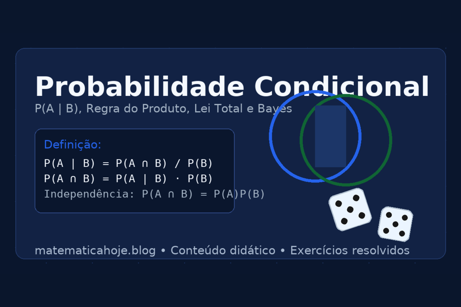 Continue lendoProbabilidade Condicional — Definição, Fórmulas, Exemplos e Exercícios Probabilidade Condicional — Definição, Fórmulas, Exemplos e Exercícios Entenda \(P(A\mid B)\), a