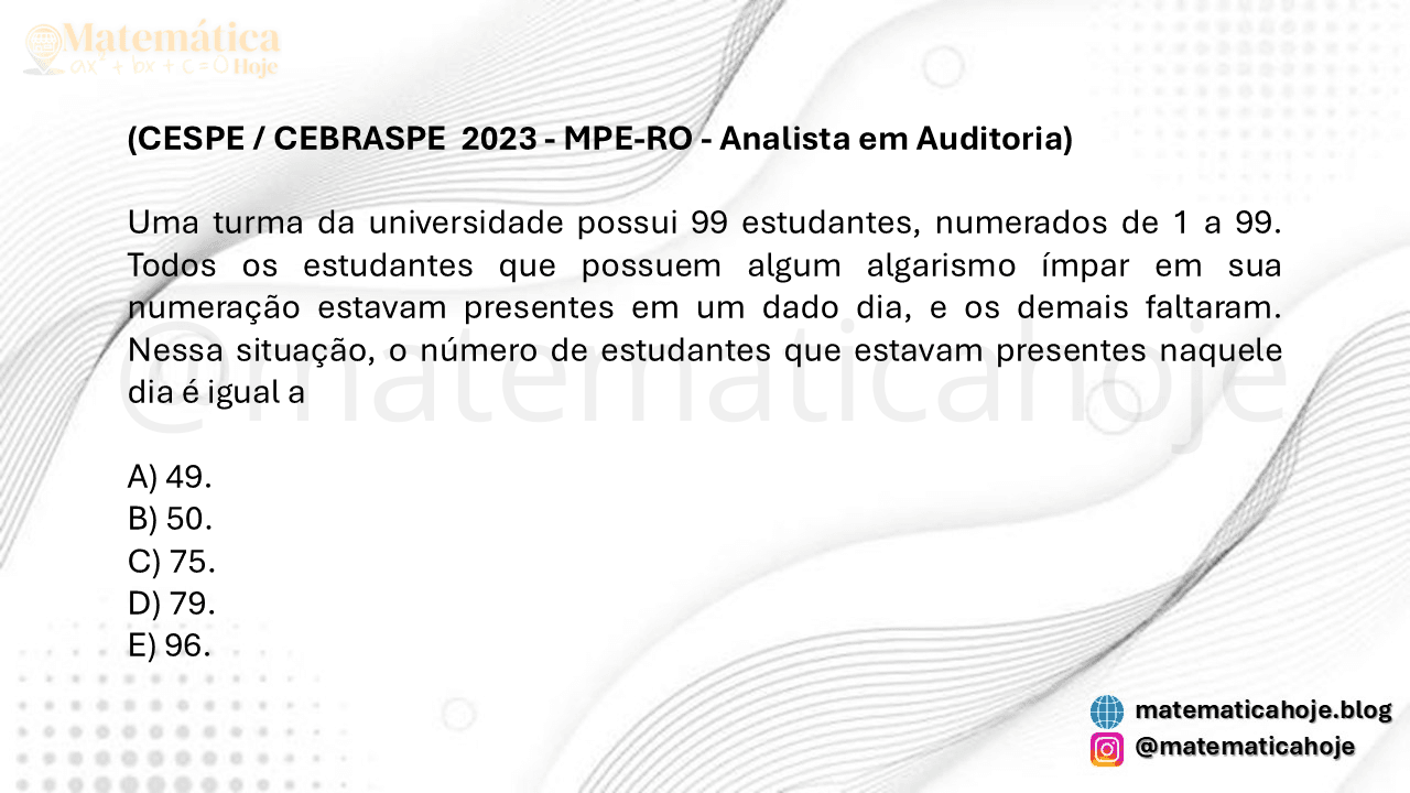 Continue lendo(CESPE / CEBRASPE 2023 – MPE-RO – Analista em Auditoria) Uma turma da universidade possui 99 estudantes, numerados de 1