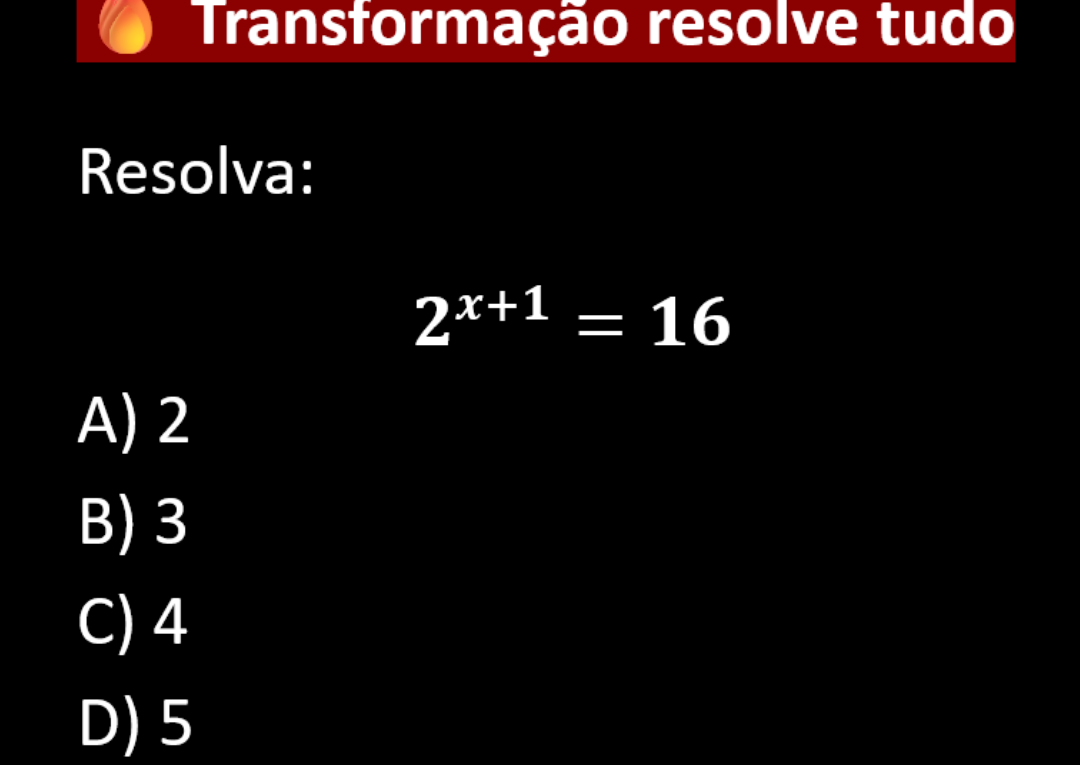 Continue lendoVer solução completa 1 – Igualando as bases: 16 = 2⎠2 – Substituindo na equação: 2^(x+1) = 2⎠3