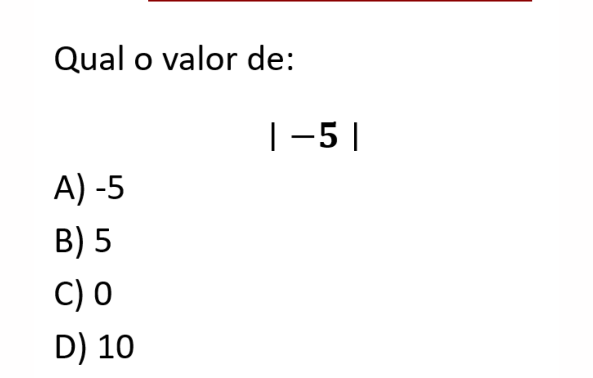 Continue lendoVer solução 1 – Entendendo o conceito: O valor absoluto representa a distĂąncia atĂ© o zero. 2 – Aplicando: |â5|