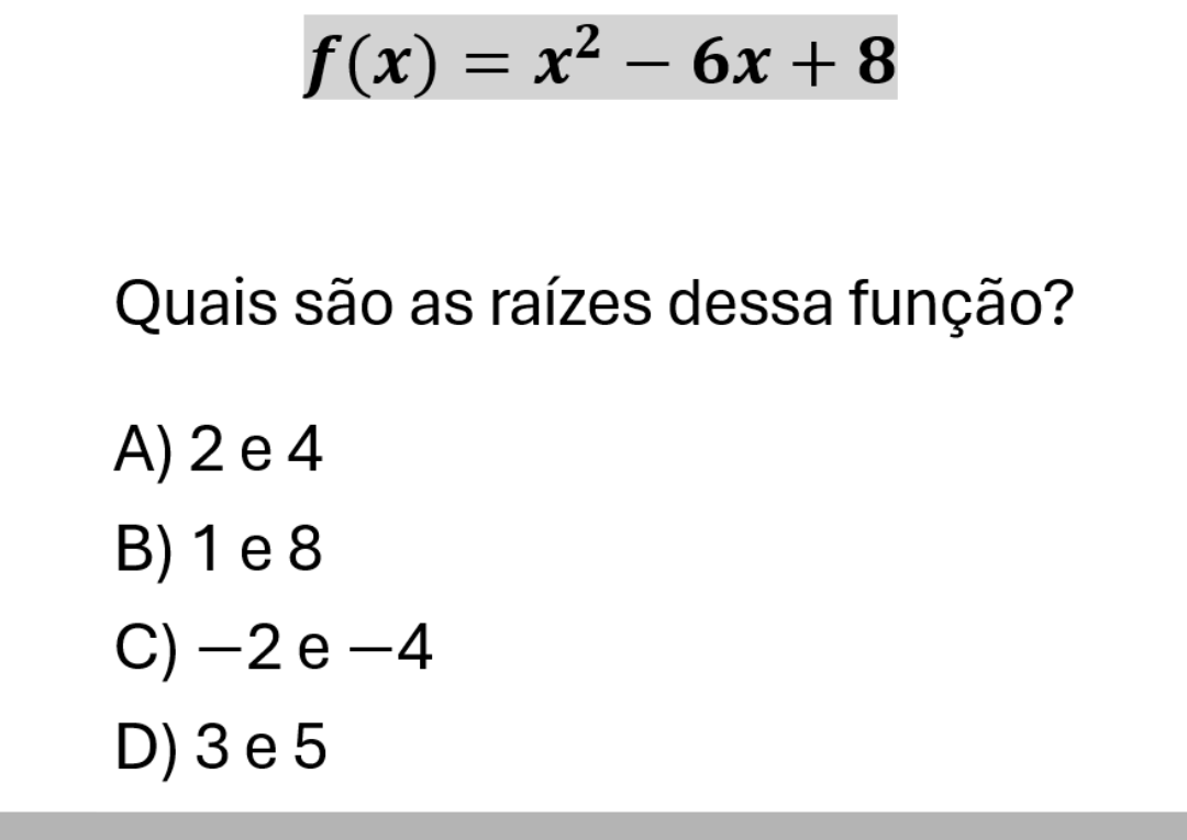 Clique aqui para ver a solução Temos a função: \[ f(x) = x^2 – 6x + 8 \] Para encontrar