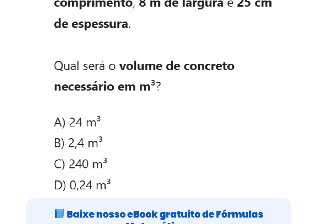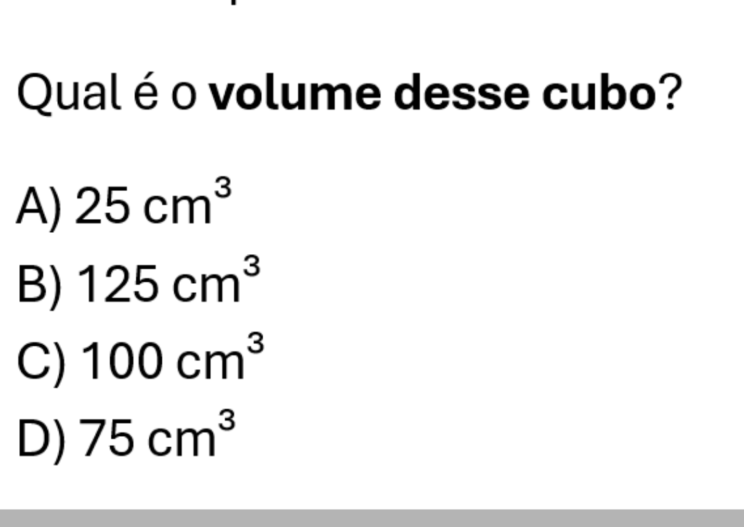 Clique aqui para ver a solução Para calcular o volume de um cubo, usamos a fórmula: \[ V = a^3