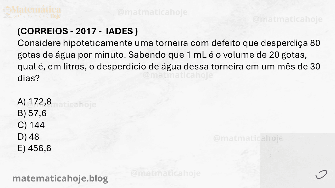 Continue lendoConsidere hipoteticamente uma torneira com defeito que desperdiça 80 gotas de água por minuto. Sabendo que 1 mL é o