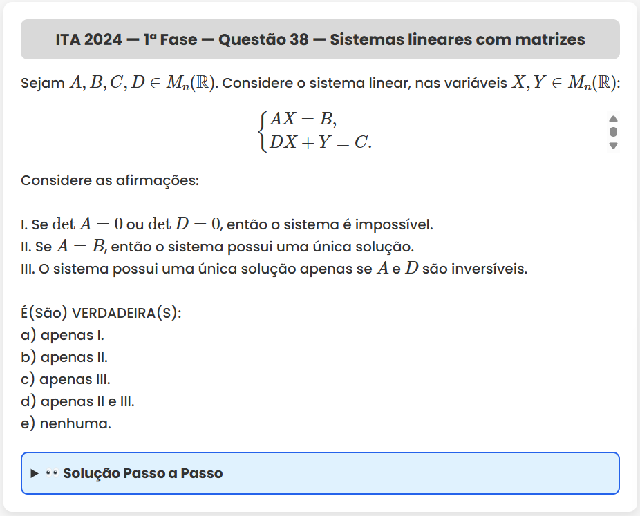 Continue lendoITA 2024 — 1ª Fase — Questão 38 ITA 2024 — 1ª Fase — Questão 38 — Sistemas lineares com