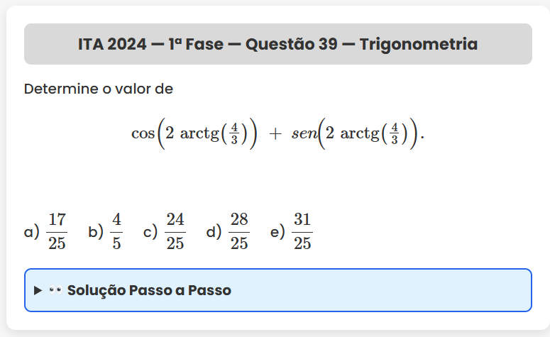 Continue lendoITA 2024 — 1ª Fase — Questão 39 ITA 2024 — 1ª Fase — Questão 39 — Trigonometria Determine o