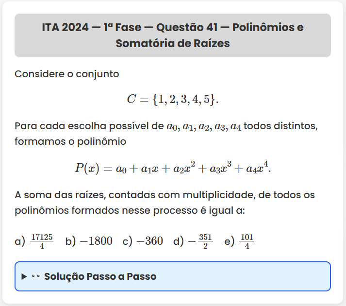 Continue lendoITA 2024 — 1ª Fase — Questão 41 ITA 2024 — 1ª Fase — Questão 41 — Polinômios e Somatória