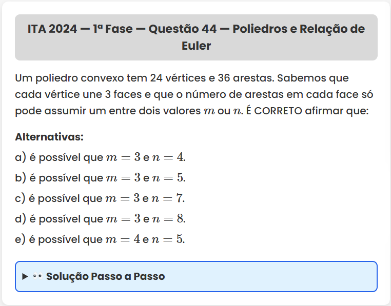 Continue lendoITA 2024 — 1ª Fase — Questão 44 ITA 2024 — 1ª Fase — Questão 44 — Poliedros e Relação