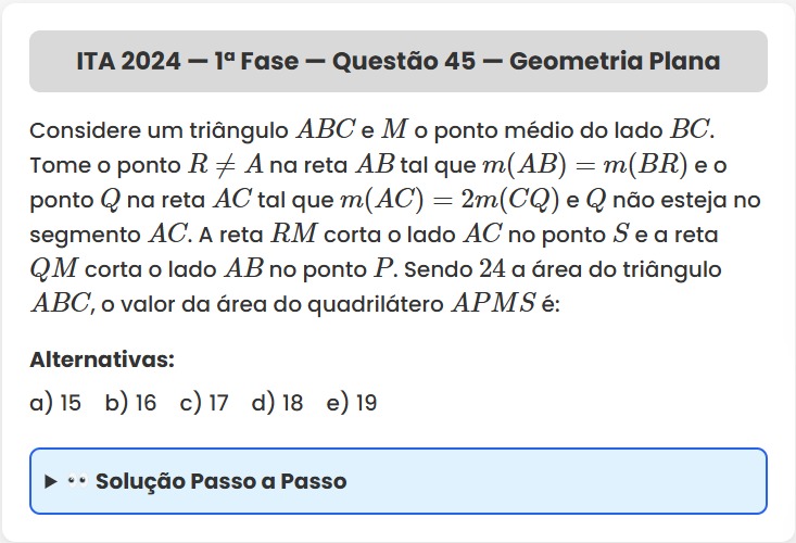 Continue lendoITA 2024 — 1ª Fase — Questão 45 ITA 2024 — 1ª Fase — Questão 45 — Geometria Plana Considere