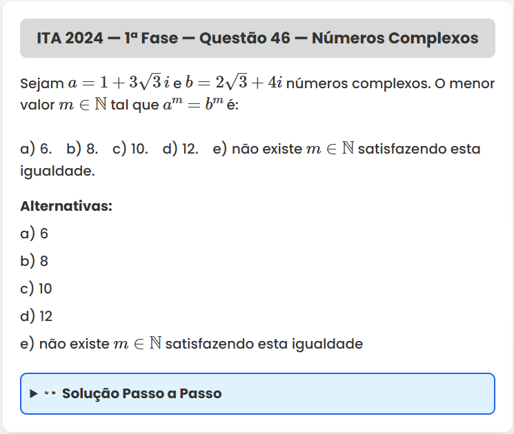 Continue lendoITA 2024 — 1ª Fase — Questão 46 ITA 2024 — 1ª Fase — Questão 46 — Números Complexos Sejam