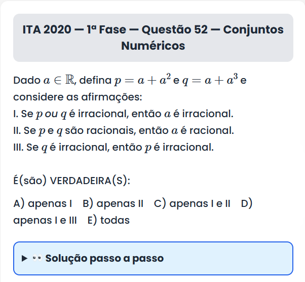 Continue lendoITA 2020 — 1ª Fase — Questão 52 ITA 2020 — 1ª Fase — Questão 52 — Conjuntos Numéricos Dado