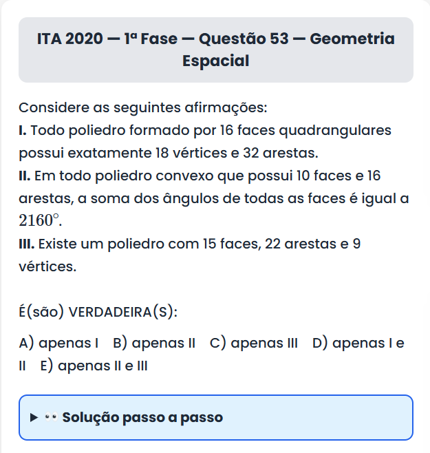 Continue lendoITA 2020 — 1ª Fase — Questão 54 ITA 2020 — 1ª Fase — Questão 54 — Geometria Espacial Considere