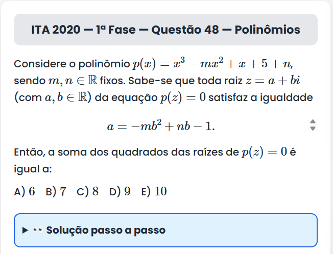 Continue lendoITA 2020 — 1ª Fase — Questão 48 ITA 2020 — 1ª Fase — Questão 48 — Polinômios Considere o