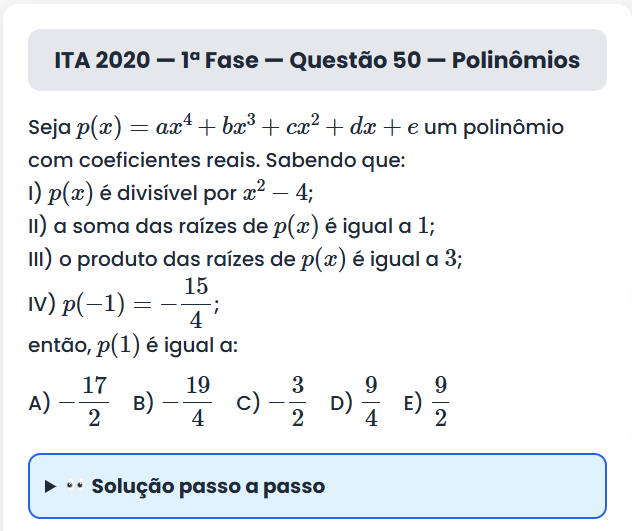 Continue lendoITA 2020 — 1ª Fase — Questão 50 ITA 2020 — 1ª Fase — Questão 50 — Polinômios Seja \(p(x)=a