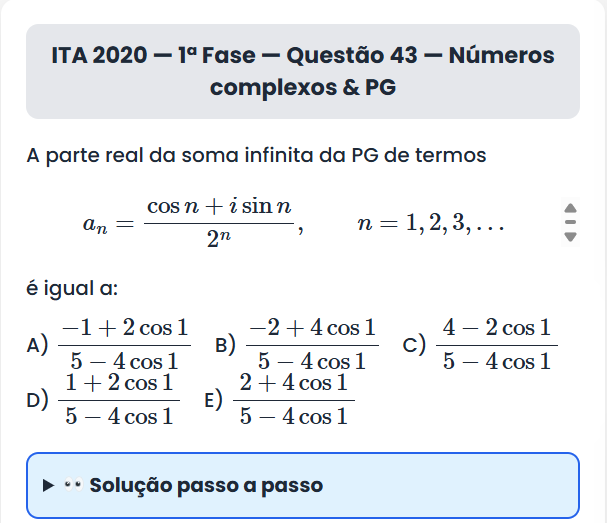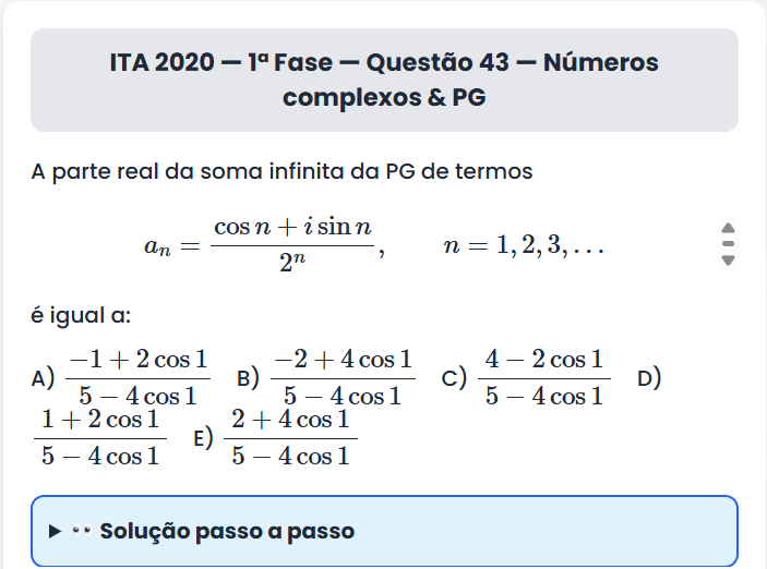Continue lendoITA 2020 — 1ª Fase — Questão 43 ITA 2020 — 1ª Fase — Questão 43 — Números complexos &