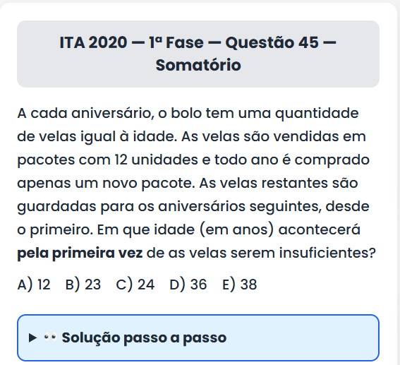 Continue lendoITA 2020 — 1ª Fase — Questão 45 ITA 2020 — 1ª Fase — Questão 45 — Somatório A cada