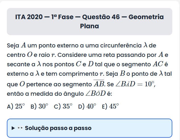 ITA 2020 — 1ª Fase — Questão 46 ITA 2020 — 1ª Fase — Questão 46 — Geometria Plana Seja