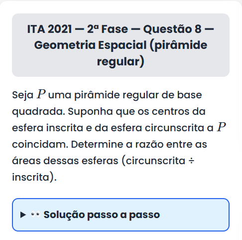 Continue lendoITA 2021 — 2ª Fase — Questão 8 ITA 2021 — 2ª Fase — Questão 8 — Geometria Espacial (pirâmide