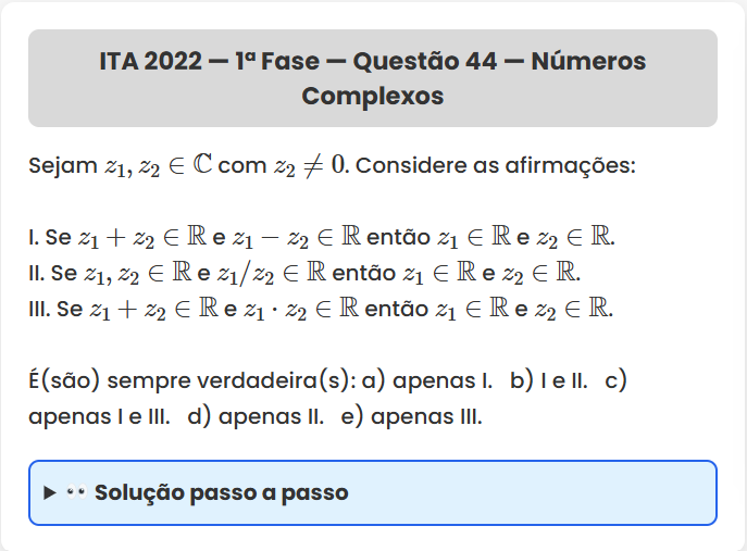 Continue lendoITA 2022 — 1ª Fase — Questão 44 ITA 2022 — 1ª Fase — Questão 44 — Números Complexos Sejam