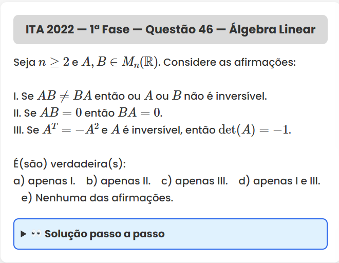 Continue lendoITA 2022 — 1ª Fase — Questão 46 ITA 2022 — 1ª Fase — Questão 46 — Álgebra Linear Seja