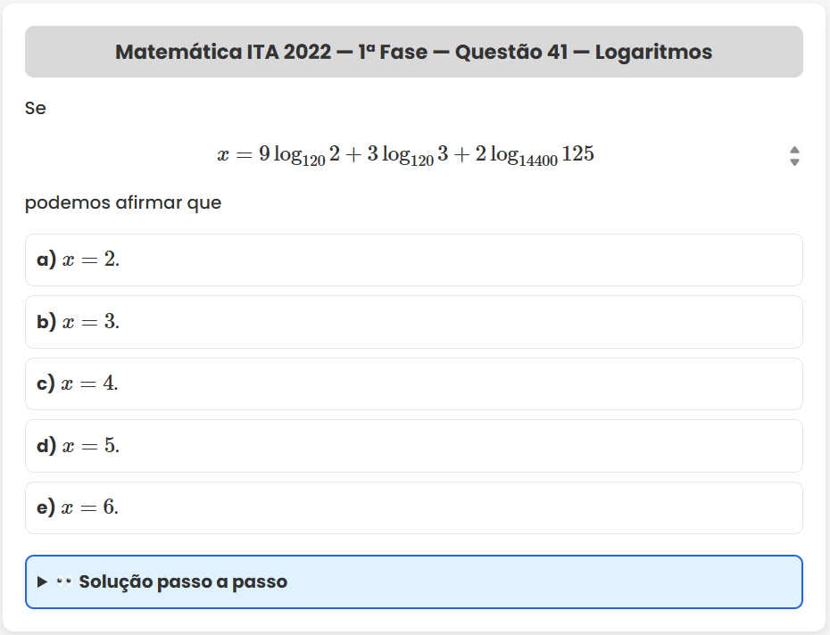 Continue lendoITA 2022 — 1ª Fase — Questão 41 ITA 2022 — 1ª Fase — Questão 41 — Logaritmos Se \[