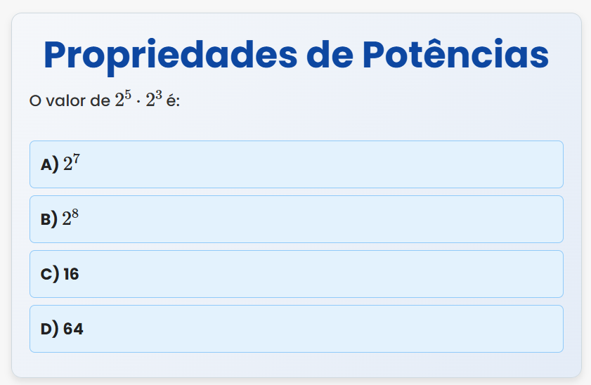 Continue lendoPropriedades de Potências O valor de \( 2^{5} \cdot 2^{3} \) é: A) \( 2^{7} \) B) \( 2^{8} \)