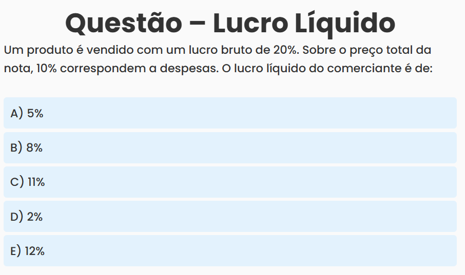 Continue lendoLucro Líquido Um produto é vendido com um lucro bruto de 20%. Sobre o preço total da nota, 10% correspondem