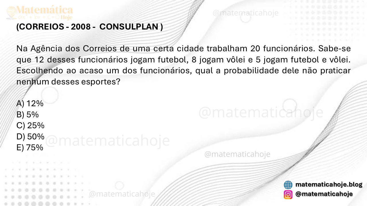 Continue lendoNa Agência dos Correios de uma certa cidade trabalham 20 funcionários. Sabe-se que 12 desses funcionários jogam futebol, 8 jogam