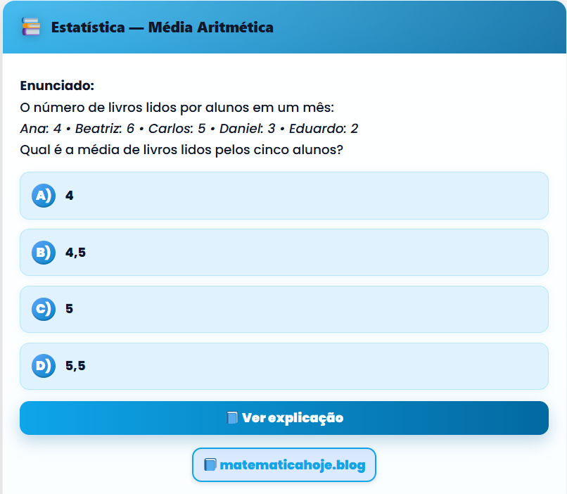 📚 Estatística — Média Aritmética Enunciado: O número de livros lidos por alunos em um mês: Ana: 4 • Beatriz:
