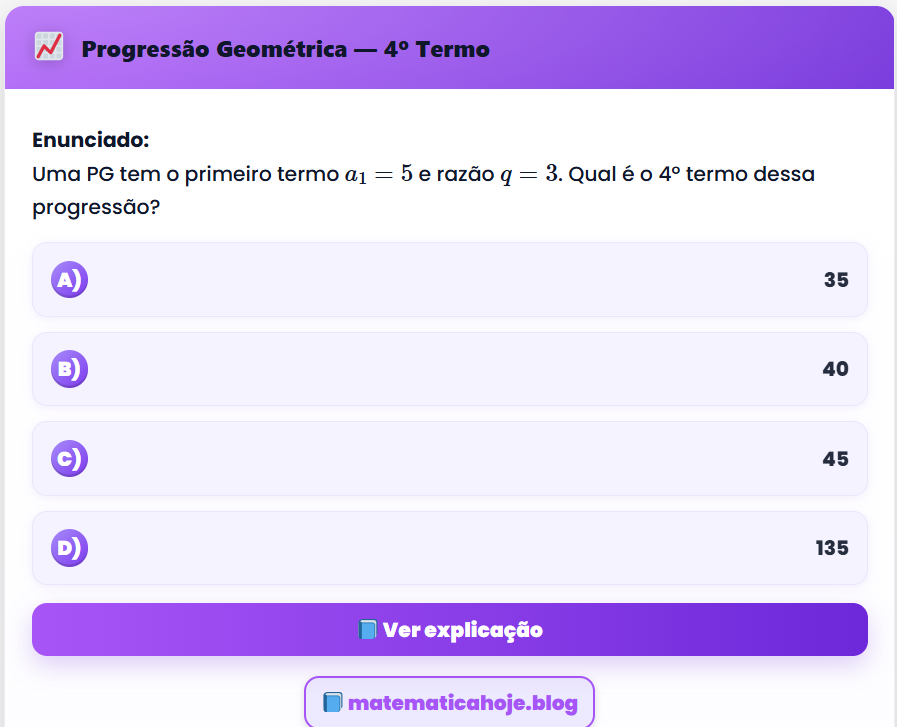 Continue lendo📈 Progressão Geométrica — 4º Termo Enunciado: Uma PG tem o primeiro termo \(a_1=5\) e razão \(q=3\). Qual é o
