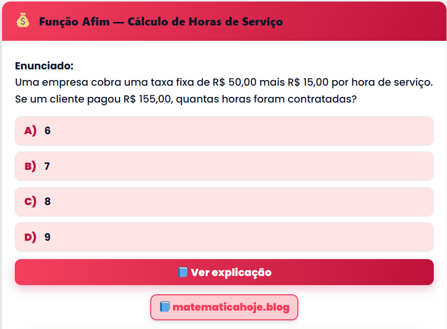 Continue lendo💰 Função Afim — Cálculo de Horas de Serviço Enunciado: Uma empresa cobra uma taxa fixa de R$ 50,00 mais