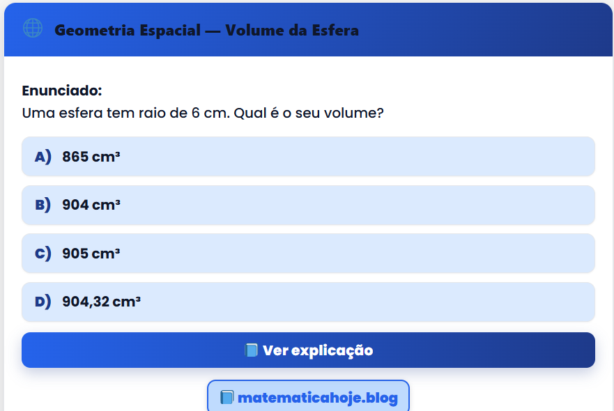 Continue lendo🌐 Geometria Espacial — Volume da Esfera Enunciado: Uma esfera tem raio de 6 cm. Qual é o seu volume?