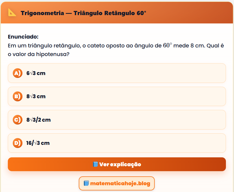 Continue lendo📐 Trigonometria — Triângulo Retângulo 60° Enunciado: Em um triângulo retângulo, o cateto oposto ao ângulo de \(60^\circ\) mede 8