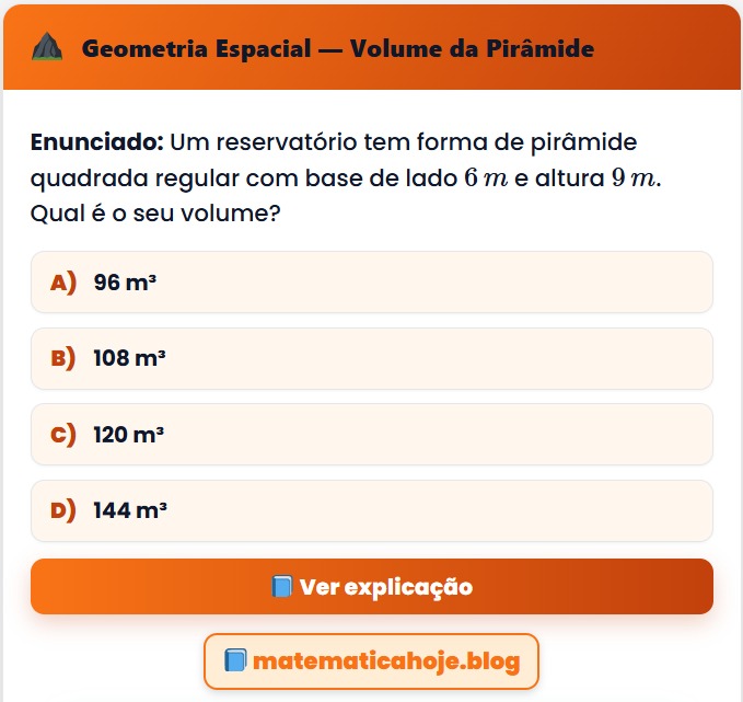 Continue lendo⛰️ Geometria Espacial — Volume da Pirâmide Enunciado: Um reservatório tem forma de pirâmide quadrada regular com base de lado