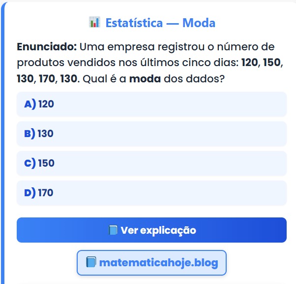 Continue lendo📊 Estatística — Moda Enunciado: Uma empresa registrou o número de produtos vendidos nos últimos cinco dias: 120, 150, 130,