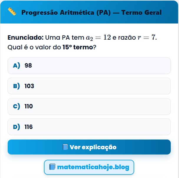 Continue lendo📏 Progressão Aritmética (PA) — Termo Geral Enunciado: Uma PA tem \(a_2 = 12\) e razão \(r = 7\). Qual