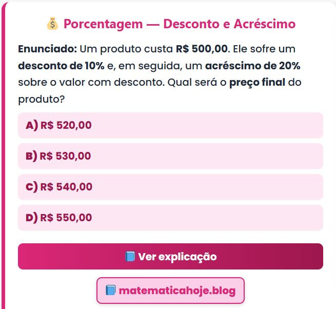 Continue lendo💰 Porcentagem — Desconto e Acréscimo Enunciado: Um produto custa R$ 500,00. Ele sofre um desconto de 10% e, em