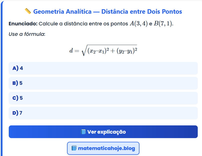 Continue lendo📏 Geometria Analítica — Distância entre Dois Pontos Enunciado: Calcule a distância entre os pontos \( A(3, 4) \) e