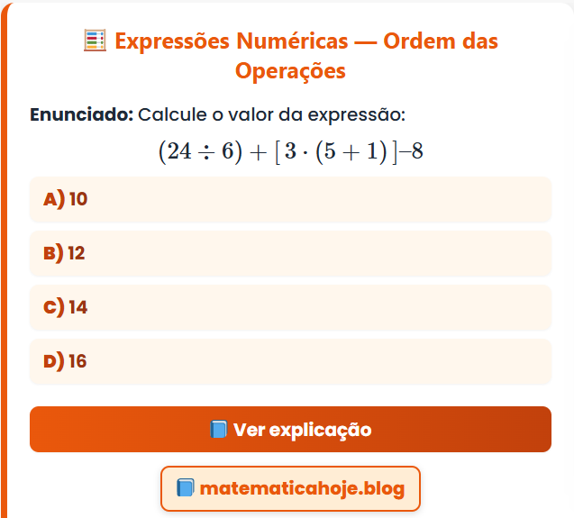 Continue lendo🧮 Expressões Numéricas — Ordem das Operações Enunciado: Calcule o valor da expressão: \(\ (24 \div 6) + [\,3 \cdot