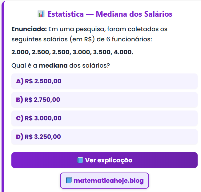 Continue lendo📊 Estatística — Mediana dos Salários Enunciado: Em uma pesquisa, foram coletados os seguintes salários (em R$) de 6 funcionários: