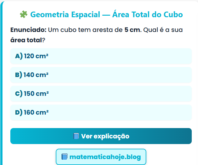 🧩 Geometria Espacial — Área Total do Cubo Enunciado: Um cubo tem aresta de 5 cm. Qual é a sua