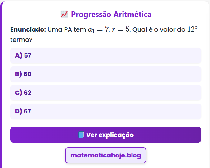 Continue lendo📈 Progressão Aritmética Enunciado: Uma PA tem \( a_1 = 7 \), \( r = 5 \). Qual é o