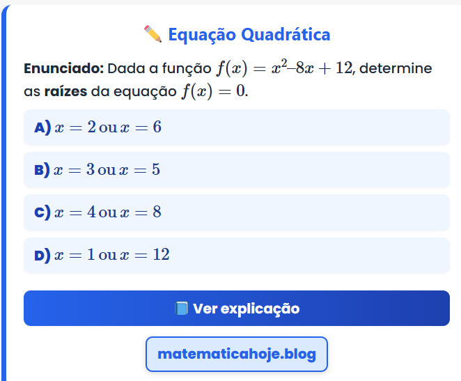 Continue lendo✏️ Equação Quadrática Enunciado: Dada a função \( f(x) = x^2 – 8x + 12 \), determine as raízes da