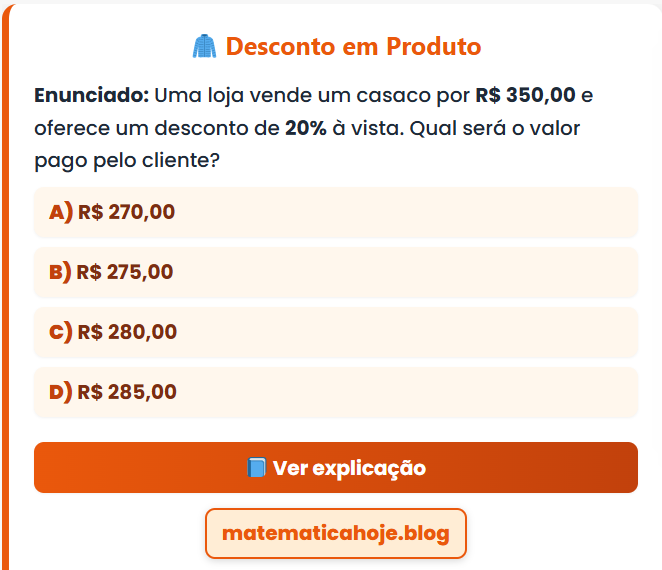 🧥 Desconto em Produto Enunciado: Uma loja vende um casaco por R$ 350,00 e oferece um desconto de 20% à
