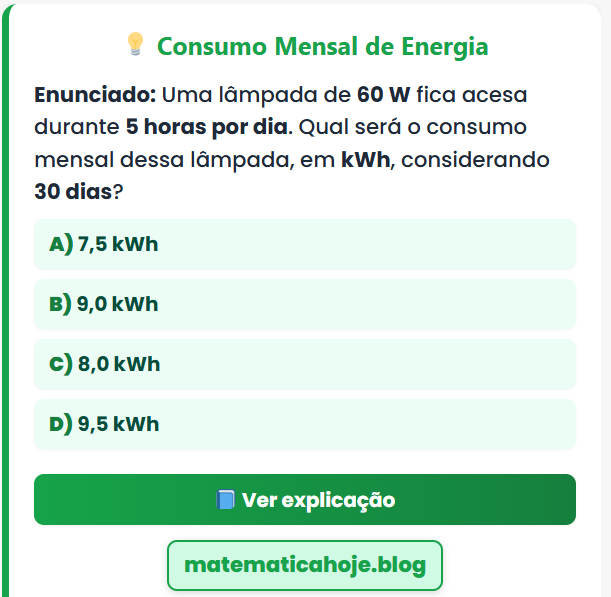 Continue lendo💡 Consumo Mensal de Energia Enunciado: Uma lâmpada de 60 W fica acesa durante 5 horas por dia. Qual será