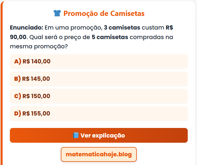 Continue lendo👕 Promoção de Camisetas Enunciado: Em uma promoção, 3 camisetas custam R$ 90,00. Qual será o preço de 5 camisetas