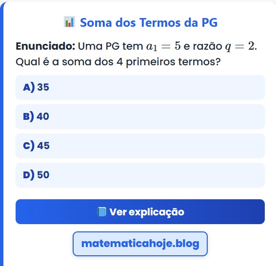 Continue lendo📊 Soma dos Termos da PG Enunciado: Uma PG tem \(a_1 = 5\) e razão \(q = 2\). Qual é