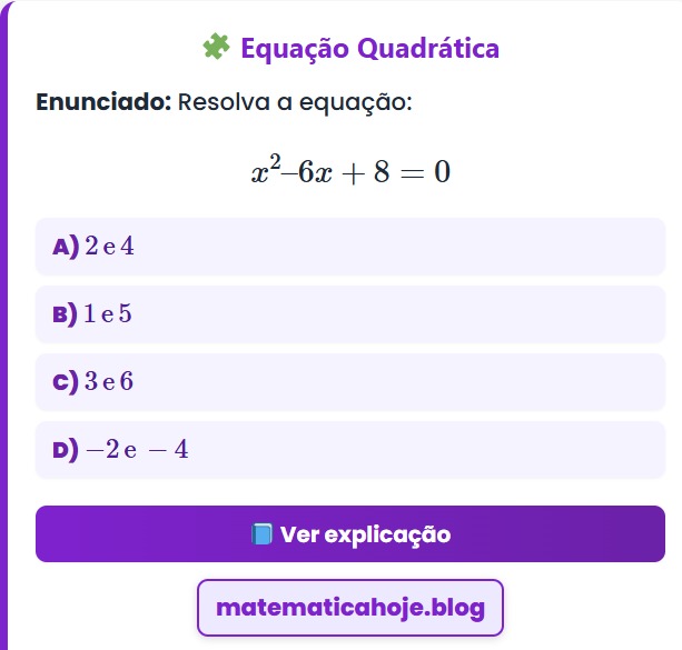Continue lendo🧩 Equação Quadrática Enunciado: Resolva a equação: \[ x^2 – 6x + 8 = 0 \] A) \(2 \, \text{e}