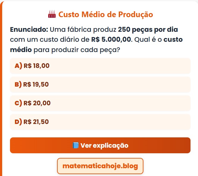 Continue lendo🏭 Custo Médio de Produção Enunciado: Uma fábrica produz 250 peças por dia com um custo diário de R$ 5.000,00.