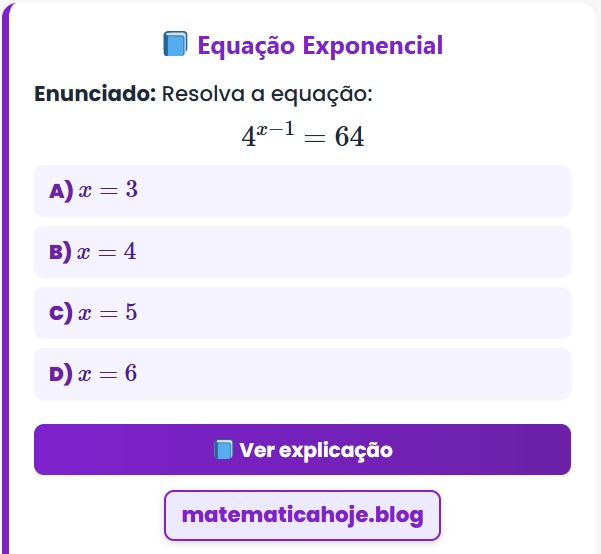 Continue lendo📘 Equação Exponencial Enunciado: Resolva a equação: \(4^{x-1} = 64\) A) \(x = 3\) B) \(x = 4\) C) \(x
