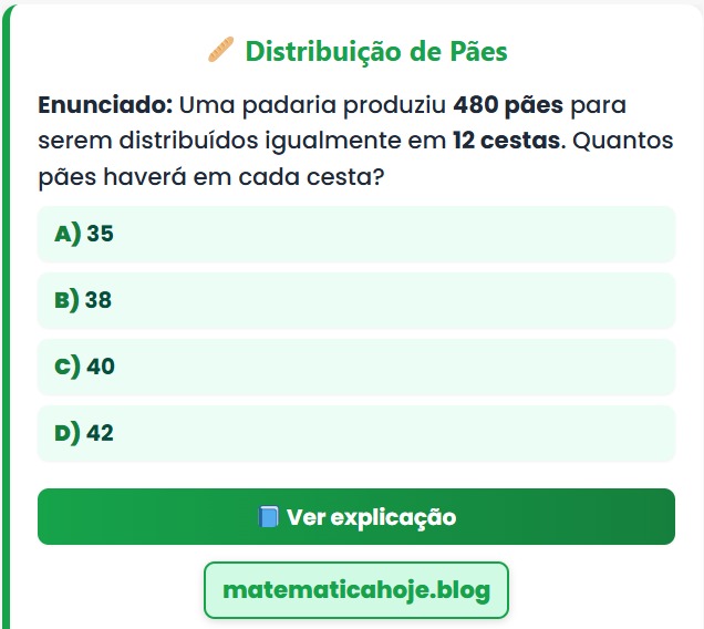 Continue lendo🥖 Distribuição de Pães Enunciado: Uma padaria produziu 480 pães para serem distribuídos igualmente em 12 cestas. Quantos pães haverá